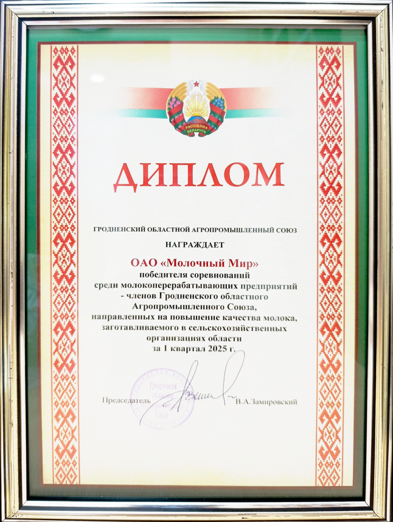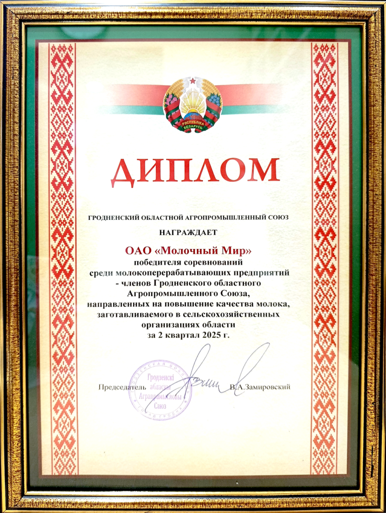 ОАО «Молочный Мир» занесен на Доску почета Гродненской области за достижение высоких показателей в экономическом развитии.